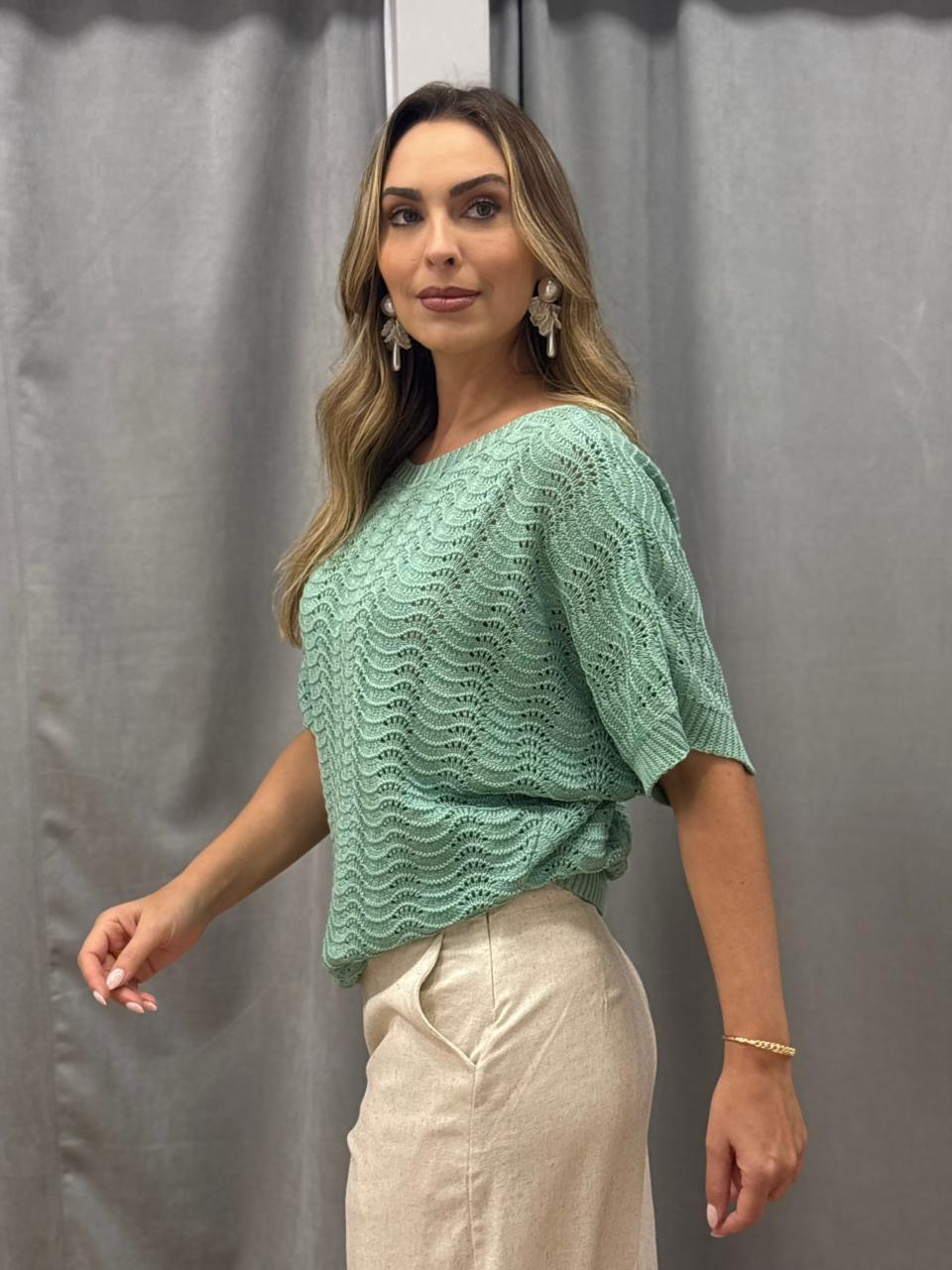 A Blusa Tricot Clara é aquela peça leve, charmosa e versátil que não pode faltar no guarda-roupa. Confeccionada em tricot com ponto vazado em ondas, traz um caimento soltinho e confortável. Possui mangas curtas amplas, decote redondo e acabamento canelado na barra e no decote, garantindo estilo e praticidade para compor looks modernos.